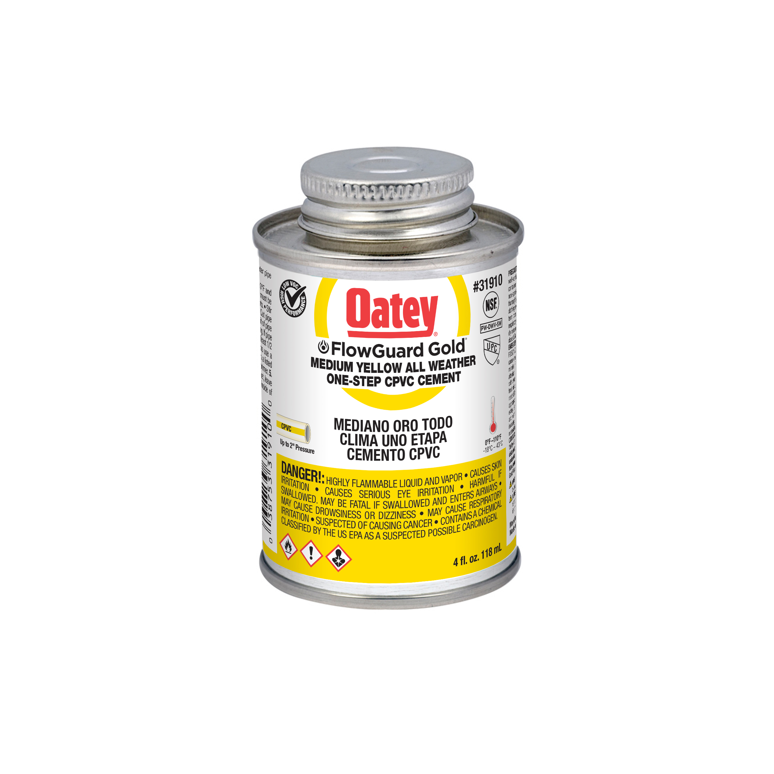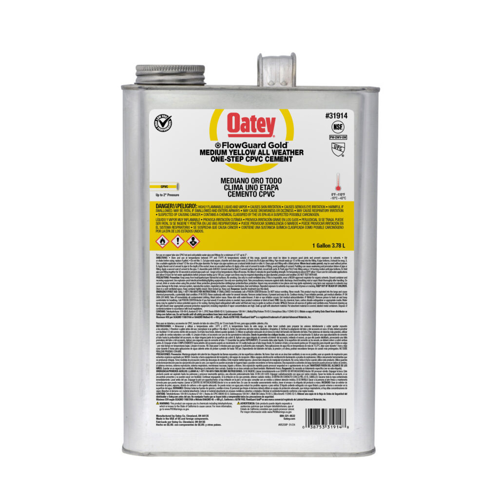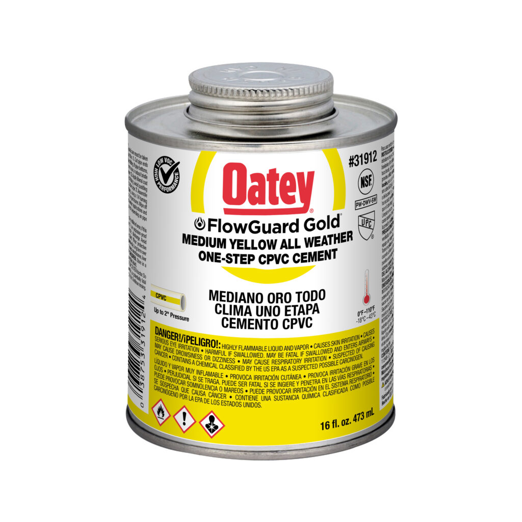 Il cemento giallo Oatey® FlowGuard Gold® 1-Step All Weather Fast Set è consigliato per impianti di acqua fredda e calda fino a 200°F. La sua formula di prevenzione è progettata per aiutare a proteggere i tubi dalla corrosione. Il suo corpo medio ha eccellenti proprietà di riempimento delle fessure ed è facile da applicare con il dauber incluso nel coperchio. Questo cemento giallo, a basso contenuto di VOC e a presa rapida, può essere utilizzato per saldare a solvente tubi in rame (CTS), tubi e raccordi in CPVC per acqua potabile calda e fredda fino a un diametro di 2 pollici con interferenza. I prodotti Oatey hanno guadagnato la fiducia dei professionisti del settore idraulico per oltre 100 anni.