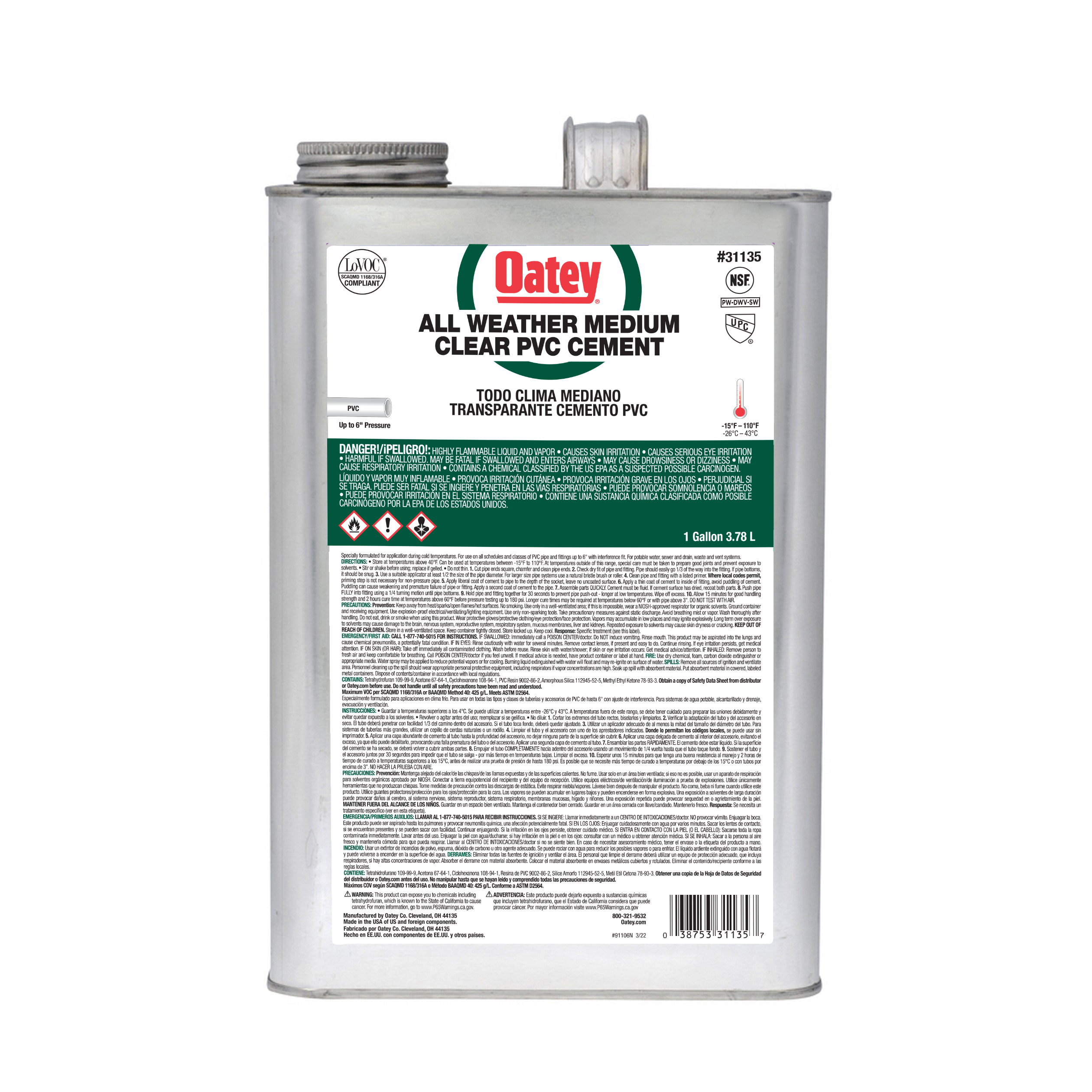 Il cemento trasparente Oatey® PVC All Weather Medium Bodied Fast Set è consigliato per applicazioni di acqua potabile, scarichi, rifiuti e sfiati. È formulato per funzionare in tutte le condizioni atmosferiche, da -15°F a 110°F, e si applica facilmente con il dauber incluso nel coperchio. Questo cemento trasparente, di media consistenza e a presa rapida può essere utilizzato per saldare a solvente tutti i tipi e le classi di tubi e raccordi in PVC fino a un diametro di 6 pollici, con un’interferenza. I prodotti Oatey hanno guadagnato la fiducia dei professionisti del settore idraulico per oltre 100 anni.